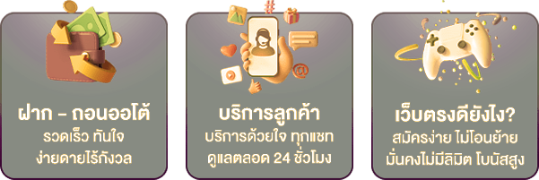 ตอบ : - ระบบฝาก-ถอนอัตโนมัติรวดเร็ว - รองรับการเล่นผ่านมือถือทุกระบบ - มีโปรโมชั่นและโบนัสมากมาย